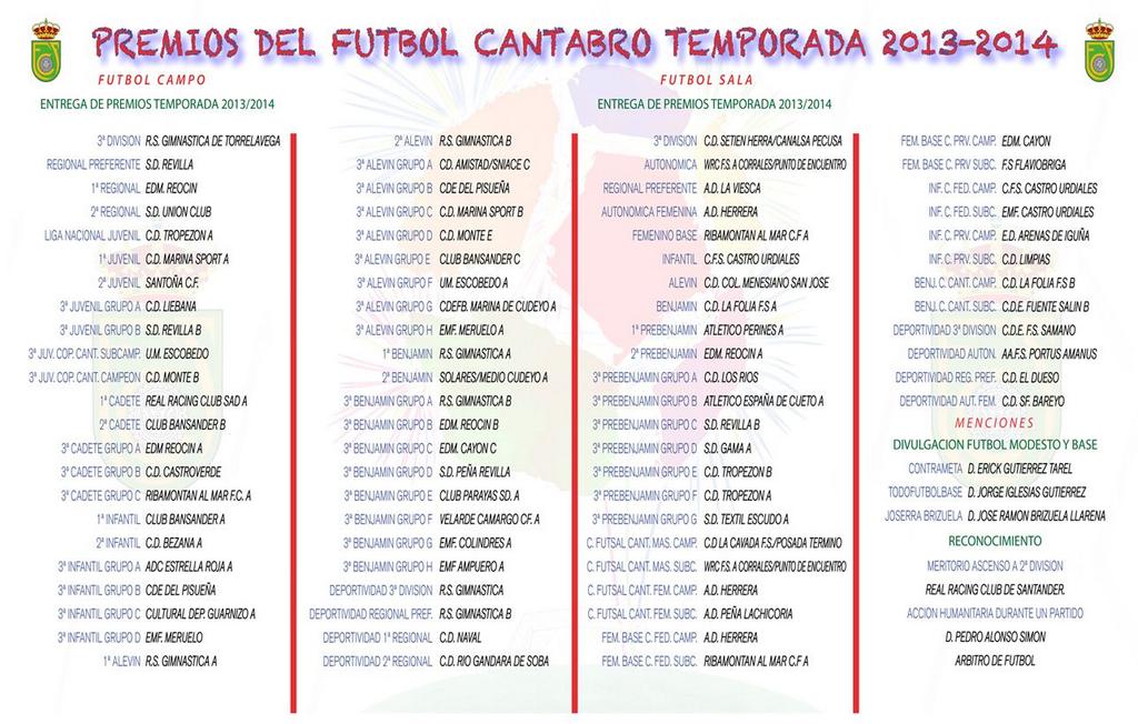 En el apartado de fútbol, la Federación premiará a los 40 campeones de todas las categorías regionales, desde la tercera división hasta el último grupo de la tercera categoría benjamín, así como al campeón y al subcampeón de la Copa Cantabria en la tercera categoría juvenil. También habrá 4 premios a la deportividad para los equipos menos tarjeteados de Tercera División, Regional Preferente y Primera y Segunda Regional.
